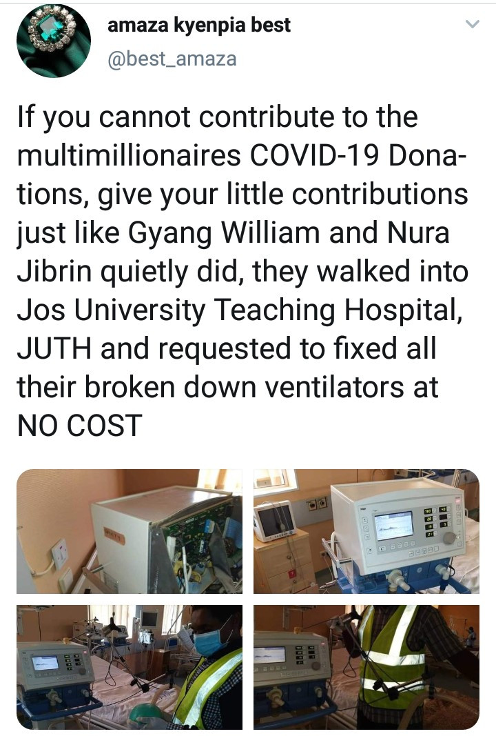 Photos shared online show Gyang William and Nura Jibrin hard at work, fixing the faulty ventilators in JUTH so that no patient will have to die due to a lack of ventilators.