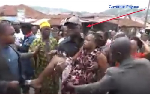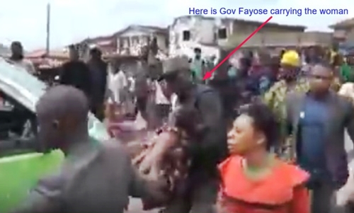 Olayinka who posted the video online, wrote; "Here is Gov Fayose personally carrying a lady, who collapsed after her shop was invaded by hoodlums and goods destroyed.