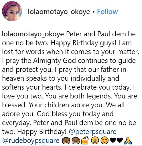 She then wrote: "Peter and Paul dem be one no be two. Happy Birthday guys! I am lost for words when it comes to your matter.
