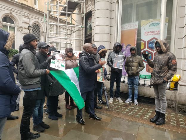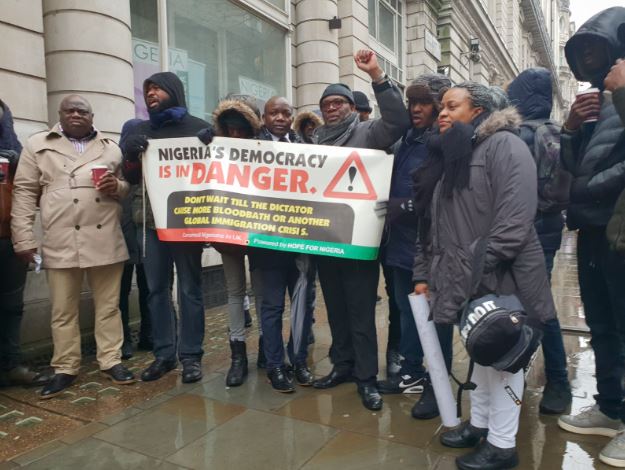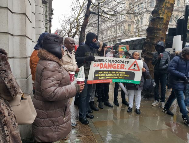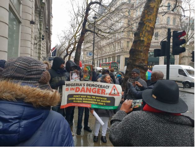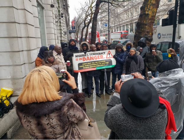 Speaking through its convener - Dr Wilson Diriwari during a protest under the bad weather at 1:00pm (London time) at Nigerian High Commission in London, the group accuses Buhari of incumbent government of President Muhammadu Buhari is unleashing fear and terror on opponents from other parties.