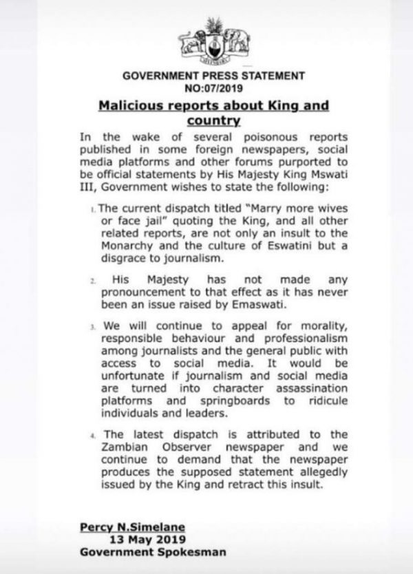 “The current dispatch titled ‘Marry more wives or face jail,’ quoting the King is not only an insult to the monarchy but a disgrace to journalism.
