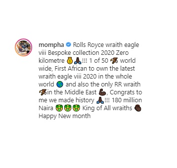‘Rolls Royce wraith eagle viii Bespoke collection 2020 Zero kilometre!!! 1 of 50 worldwide, First African to own the latest wraith eagle viii 2020 in the whole world and also the only RR wraith in the Middle East, Congrats to me we made history !!! 180 million Naira. King of All wraiths. Happy New month.’