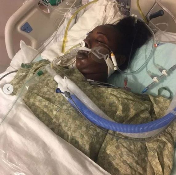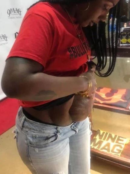 Pictures posted to Takieyah's Instagram show a large opening down the front of her abdomen and repaired skin bulging from the damaged part of her stomach.