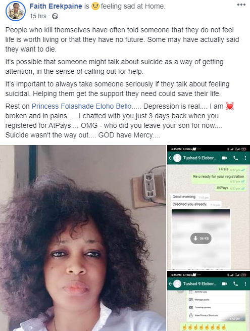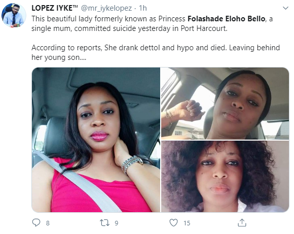 A Nigerian woman has died by suspected suicide in Port Harcourt after taking to Facebook to post a cry for help that no one took seriously.