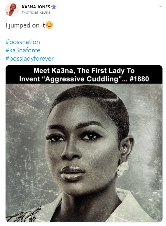 Former Big Brother Naija lockdown housemate, Kate ‘Ka3na’ Jones has jumped on the trending #history meme and she playfully laid claim to being the first lady to invent ”aggressive cuddling”.