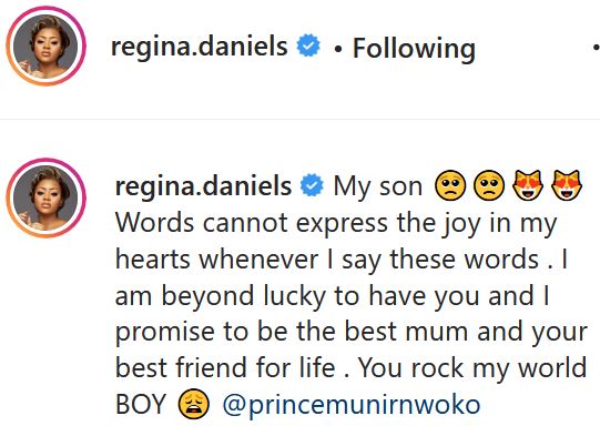 One of Nigeria's very popular actresses, Regina Daniels is apparently a very happy and proud mom at the moment.
