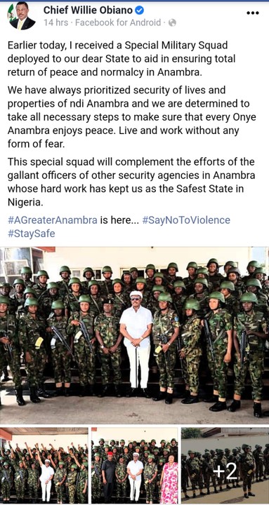 The Governor of the State, Willie Obiano confirmed the development in a post he shared on his verified Facebook page. He also shared photos of the soldiers showing him posing with them.