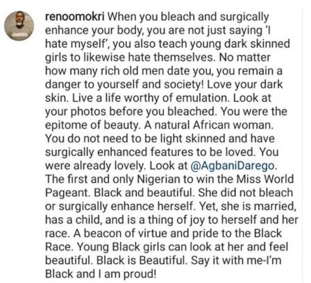 ''When you bleach and surgically enhance your body, you are not just saying ‘I hate myself’, you also teach young dark skinned girls to likewise hate themselves. No matter how many rich old men date you, you remain a danger to yourself and society! Love your dark skin.Live a life worthy of emulation. Look at your photos before you bleached. You were the epitome of beauty. A natural African woman. You do not need to be light skinned and have surgically enhanced features to be loved. You were already lovely. Look at @AgbaniDarego.