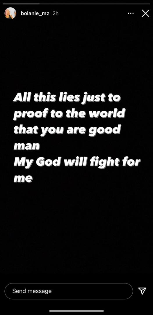 Taking to her Insta-stories Bolanle wrote, “All these lies just to proof to the world you are good man my God will fight for me”.